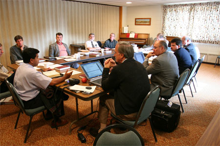 Our meeting took place at the facilities of Hingham Reformed Church (RCA)in Hingham, Wisconsin. Those attending are as follows from left to right: Geoffrey Donnan (Teaching Elder, Palm Bay, FL); Anthony Dallison (Observer: Teaching Elder, Reformed Presbyterian Church, Hanover Presbytery and Presbyterian Church in America member); Jerry Clay (Ruling Elder, Janesville, WI); Frank Smith (Teaching Elder, Sheboygan, WI); Brian Schwertley (Teaching Elder, Manawa, WI); Olev Tauts (Ruling Elder, Manawa, WI); Marty Waltho (Teaching Elder, Manawa, WI); Dan Gibson (Teaching Elder, Janesville, WI); Rudy Poettcker (Teaching Elder, Paramaribo, Suriname); Ron DeTroye (Ruling Elder, Sheboygan, WI); Pastor Bakker (Observer: Teaching Elder, host church, Hingham, WI).