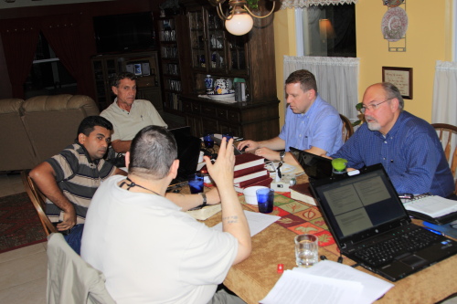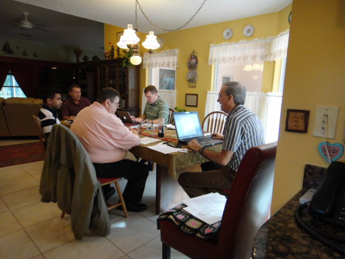 Our meeting took place at the home of Rev. & Mrs. Geoffrey Donnan in Indian River County, Florida, Co-Pastor of the King's Reformed Presbyterian Church of Palm Bay. The gathered delegates at this presbytery: from left to right are: Geoffrey Donnan (Teaching Elder, Palm Bay, FL); Mike Waters (Teaching Elder, Sovereign Grace Church, Des Moines, IA), Asgar Hamid (Teaching Elder, Paramaribo, Suriname, So. America); Rudy Poettcker (Teaching Elder, Palm Bay, FL); David Stevens (Ruling Elder, Sovereign Grace Church, Des Moines, Iowa) and Dan Gibson (Teaching Elder, Missionary to Janesville, WI area); .